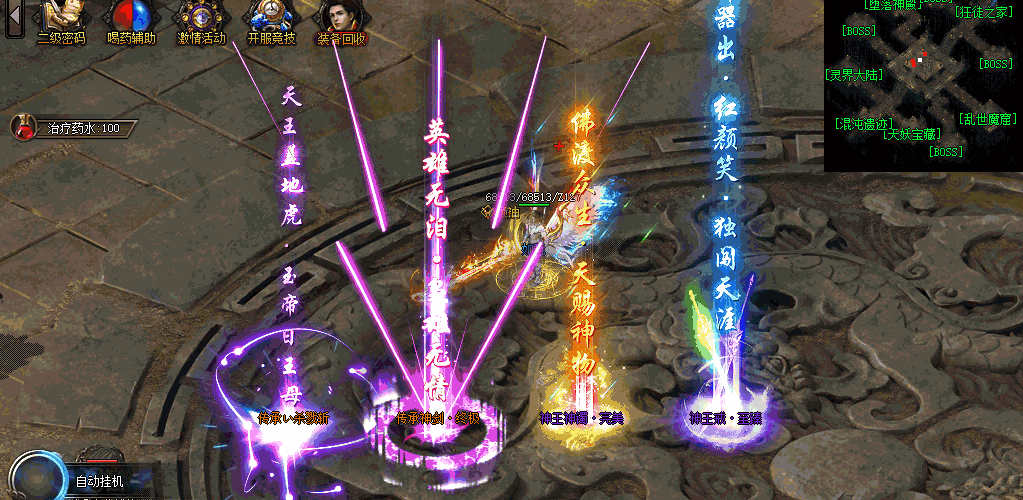 升级快,打怪爽,装备不花,不乱,小翅膀,小光效,经典看不腻!!支持手机三端挂机打宝24小时不间断
